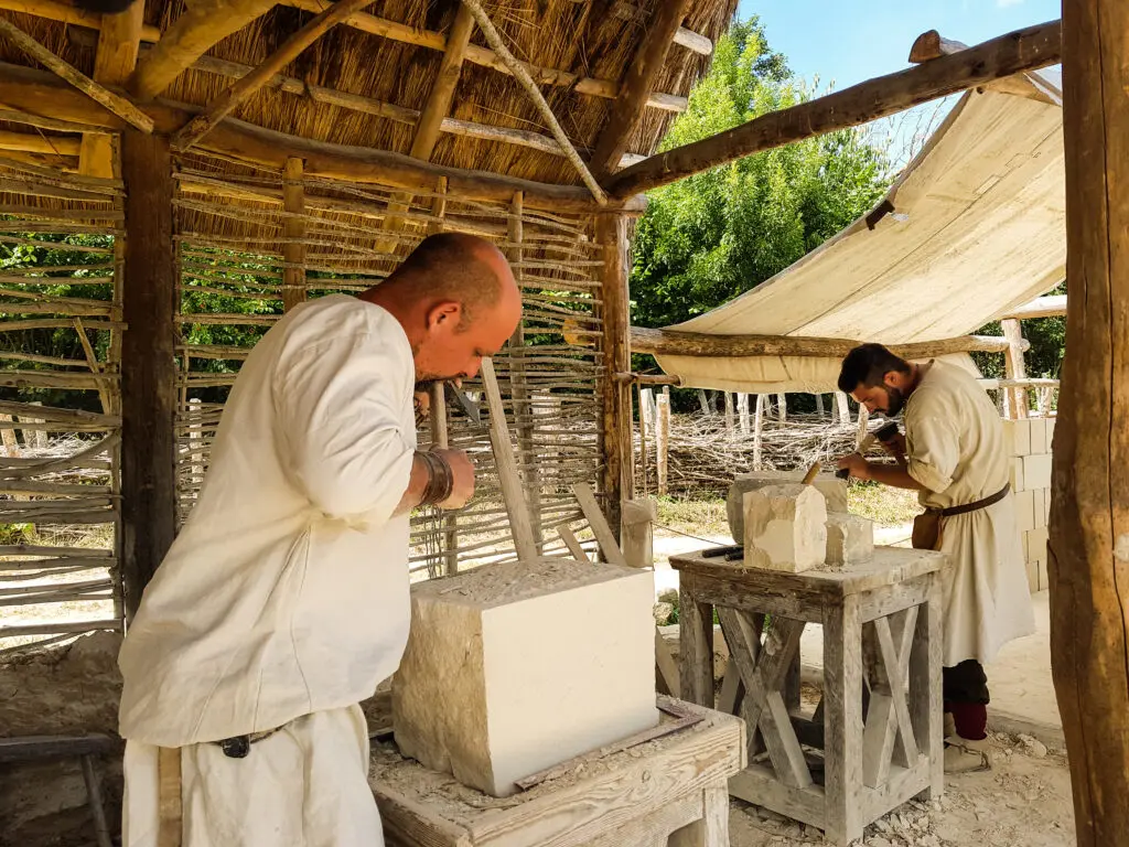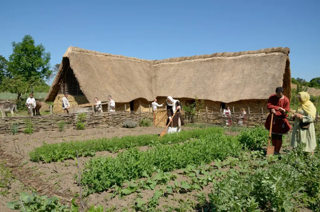 Dans cet espace naturel préservé de 10 hectares, des bénévoles, des entreprises régionales et des chantiers d’insertion s’associent pour bâtir, forger, tisser, cultiver… selon les savoir-faire et avec les matériaux utilisés à l’époque.